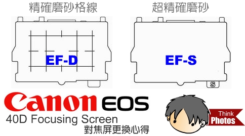 第一種為EF-D.俗稱井字對焦屏.另一種為EF-S.超精確磨砂.適用於大光圈鏡頭.