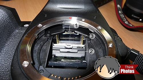 如上圖所示.只要把對焦屏釋放卡筍按下去(如圖一)對焦屏就會自行放下(如圖二)